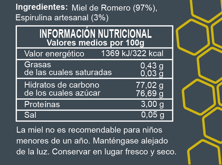 Nuestra SpiruMiel de Romero es más que un simple endulzante; es un concentrado de nutrientes cuidadosamente elaborado: